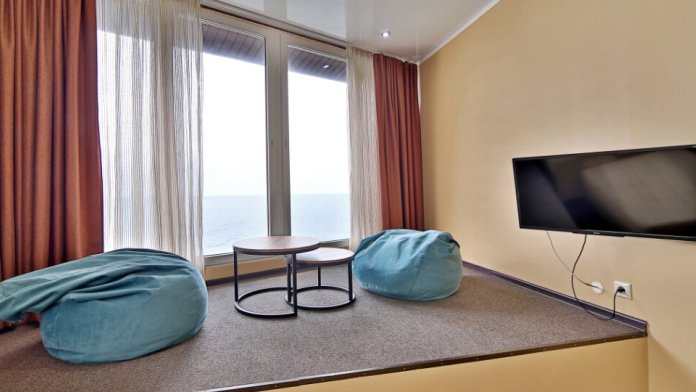 Панорамный вид зачаровывает и не оставляет никого равнодушным. Не выходя из номера Вы сможете насладиться встречей рассвета и заката. Номер полностью укомплектован всем необходимым (кондиционер, телевизор, холодильник, ванная комната, чайник и все необходимые принадлежности). Номер состоит из двух изолированных комнат, спальня и гостиная.