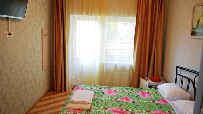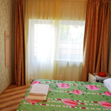 В номере односпальные или двуспальная кровати, шкаф, пуфики, прикроватные тумбочки, туалетный столик, вешалка, зеркало, сплит-система, телевизор, холодильник, фен, посуда; доп.место - раскладушка на ламелях с матрасом 190*70 см до 100 кг