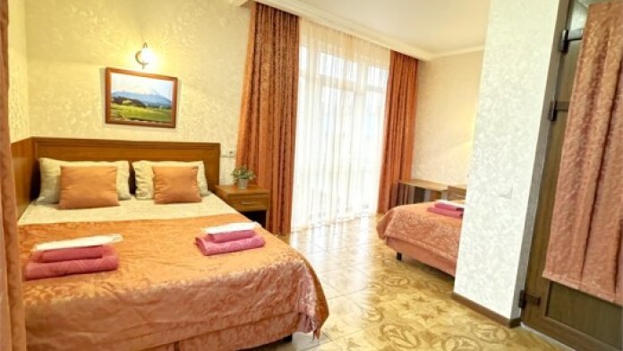 Комфортный трехместный номер с балконом состоит из комнаты и санузла (общая площадь 20-25 м2). Номера данной категории расположены на 2, 3, 4 этажах. Номер оснащен двуспальной кроватью, односпальной кроватью с ортопедическими матрасами и раскладным диваном (ширина 1,2 м), тумбочками, шкафом для одежды, туалетным столиком с зеркалом, журнальным столиком, мини-холодильником, кондиционером, телевизором с плоским экраном. Номер укомплектован постельным бельем, полотенцами. В ванной комнате, укомплектованной феном и набором туалетно-косметических принадлежностей, установлен душ.