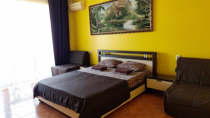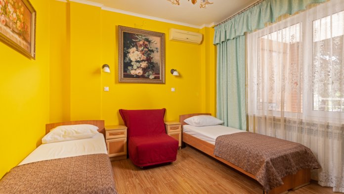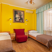 Стандарт с раздельными кроватями 2+1 .Оформленные в современном стиле, комфортабельные комнаты категории «Стандарт 2+1», рассчитанные на размещение 3 человек. Обеспечены всем необходимым для полноценного отдыха. Расстояние до моря 600 метров. Санузел в номере.