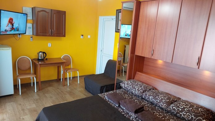 Комфортабельные комнаты рассчитанные на размещение от 1 до 4 человек, цена указана за номер. Комнаты оснащены: двуспальной кроватью, LCD телевизором, сплит системой, сейфом для удобства хранения ценных вещей, холодильником, отдельным санузлом, посудой и wi-fi. Дополнительные места, комфортабельные кресло - кровать. На каждом этаже есть гладильная доска с утюгом.