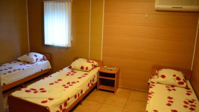 Недорогой номер для четверых человек в общем корпусе. Выход из номера на общую территорию со столом и мангальной зоной.