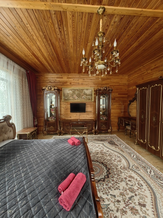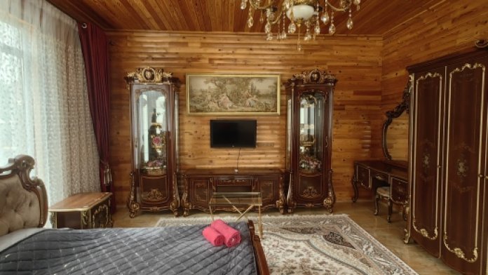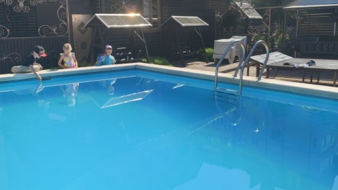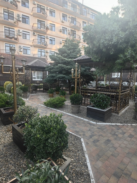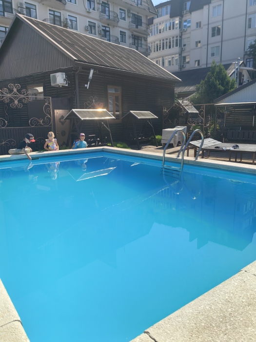 Территория просторная. Установлен бассейн, Во дворе много зелени, есть места для отдыха: шесть беседок, которые вмещают в себя до 8 человек. Для любителей блюд на углях есть 2 мангальные зоны .
