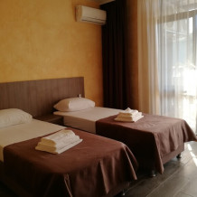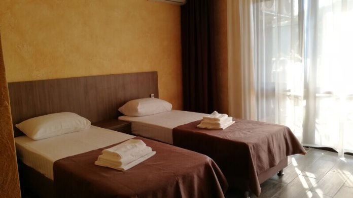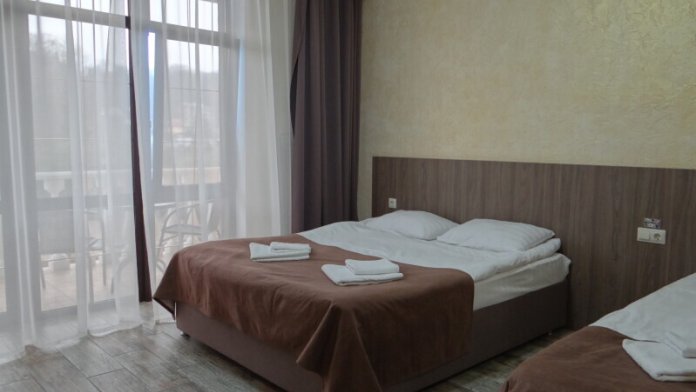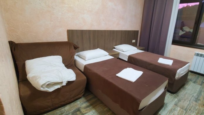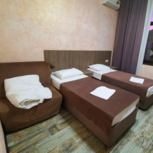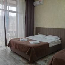 Номер состоит из просторной спальни, ванной комнаты, санузла, а также прихожей. В спальне установлена большая двухместная кровать и одноместная кровать. Мебель удобная, техника современная, на стене висит телевизор с плоским экраном, расположен холодильник, чайник. Кроме этого гости могут бесплатно пользоваться феном, утюгом. Из мебели здесь есть просторный шкаф, предоставляются вешалки для одежды. В зимний период подается бесперебойное отопление.