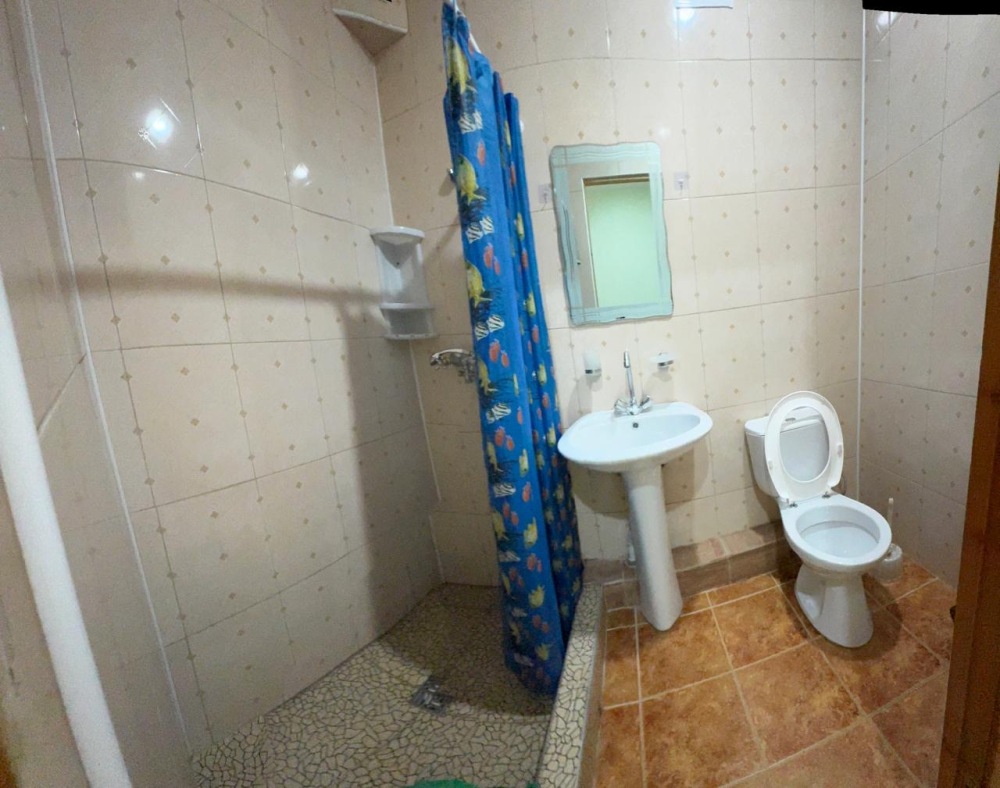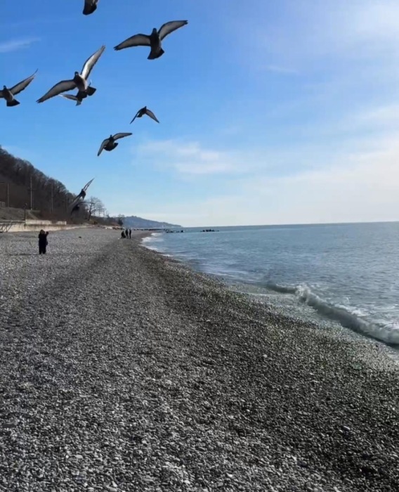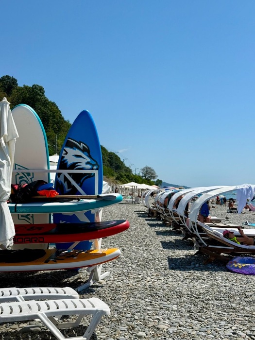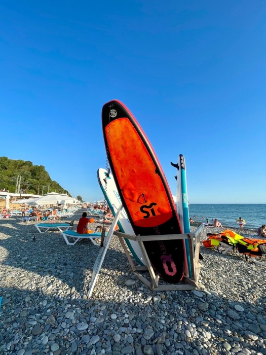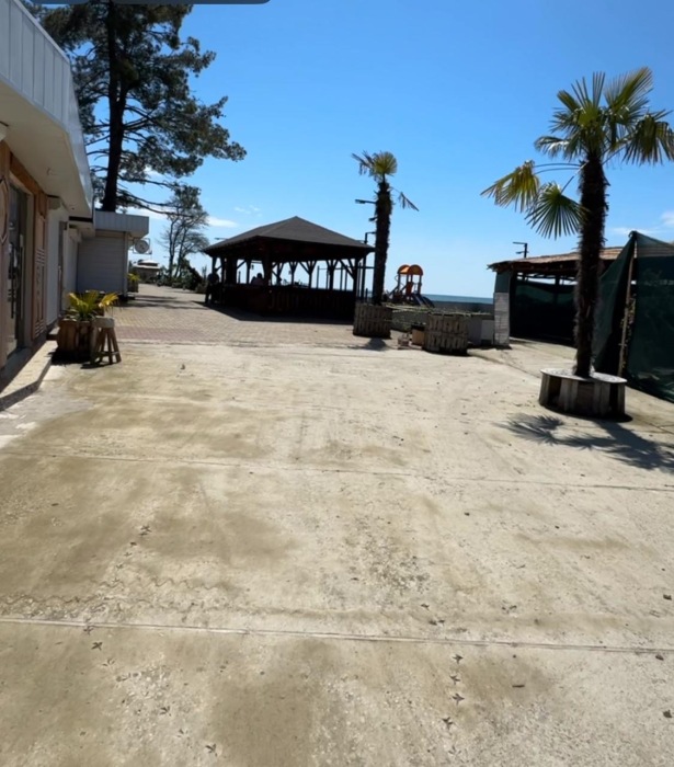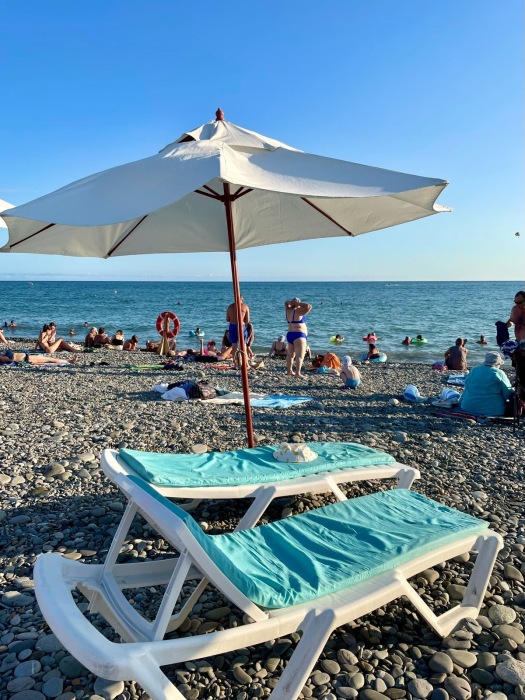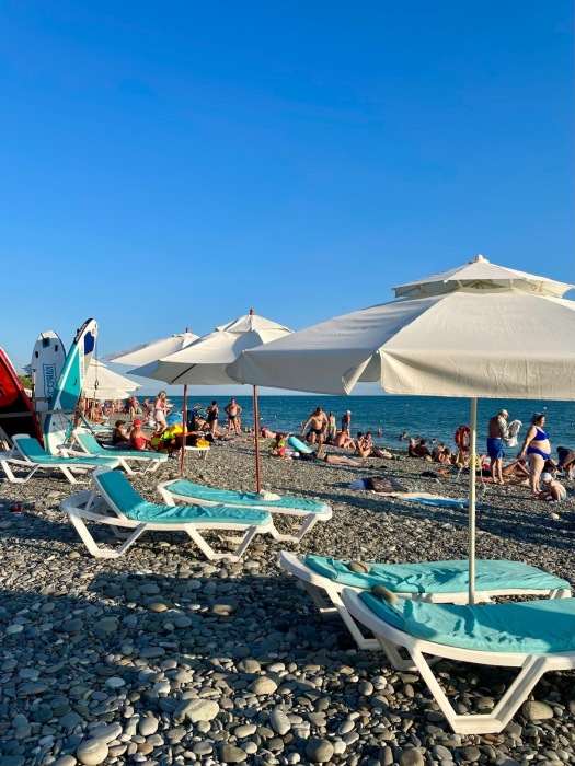 До пляжа прогулочным шагом не более 7 минут. По пути много кафе и столовых. Пляж чистый и галечный. Так же на берегу много акваразвлечений: горка, скутеры, катамараны и т. п.