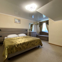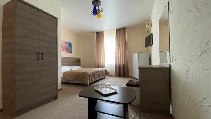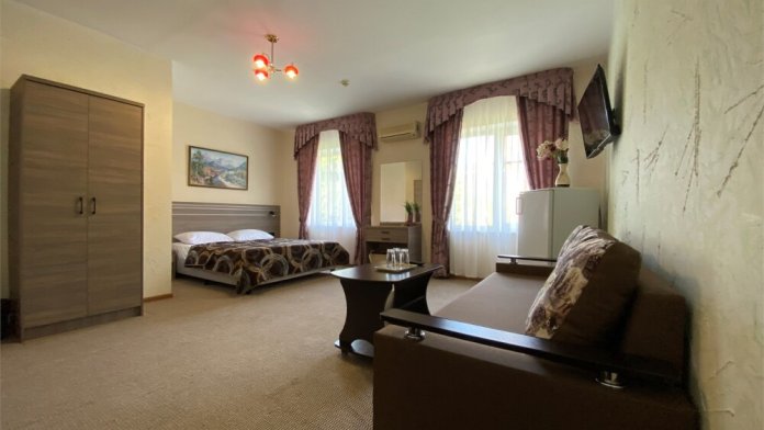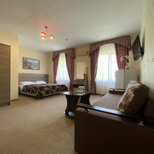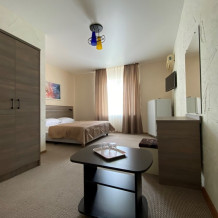 Однокомнатный номер первой категории. В номерах спальный гарнитур, мягкая мебель, журнальный столик, настольные лампы, сплит система кондиционирования, холодильник, плазменный телевизор, ковровое покрытие, сан блок – туалет, душ, умывальник с гигиеническими принадлежностями.