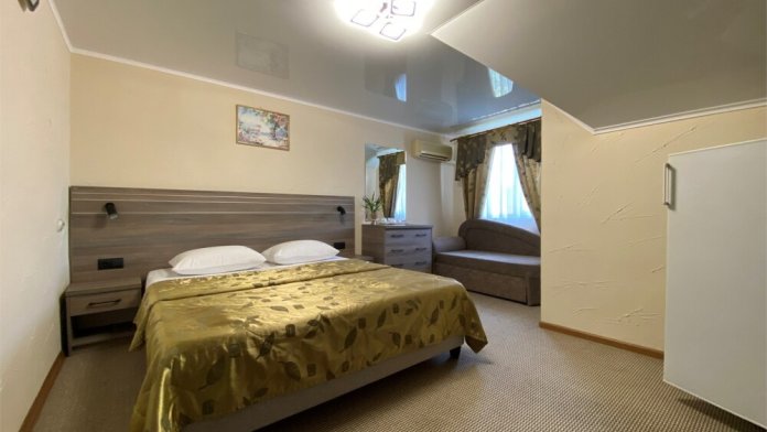 Двухместный номер первой категории, одна двуспальная кровать, прикроватные тумбочки, кресло, плательный шкаф, санузел, сплит-система, холодильник, фен, телевизор.