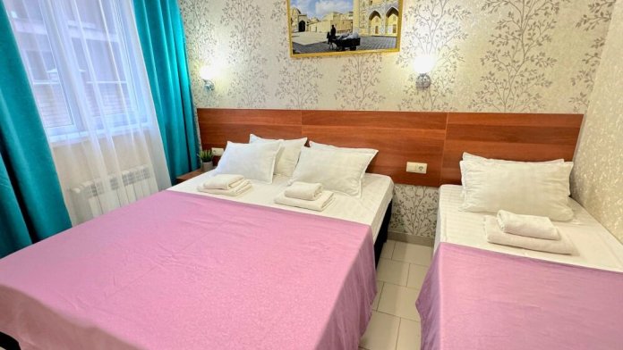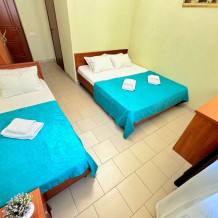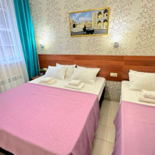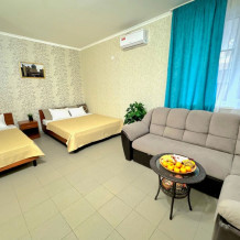 Номер без балкона с собственной ванной комнатой. В номере предусмотрены двуспальная кровать и односпальная кровать, двухместный диван, прикроватные тумбочки, шкаф, зеркало, стол и стулья. Номер оснащен телевизором, сплит-системой, мини-холодильником, чайником, феном, принадлежностями для душа.