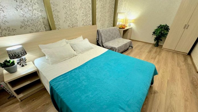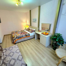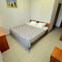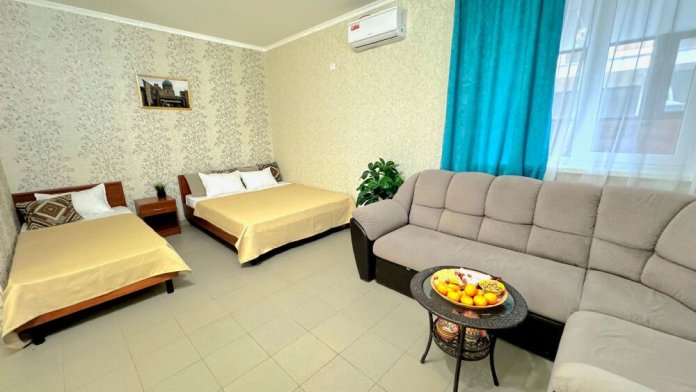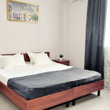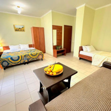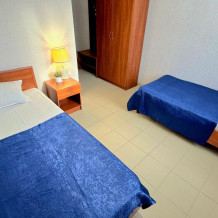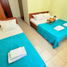 Просторный 2-комнатный номер с индивидуальным балконом и собственной ванной комнатой. В одной комнате двуспальная кровать и диван, во второй комнате 2 односпальные кровати (с возможностью соединить). Номер оснащен шкафом, столом и стульями, сплит-системой, телевизором, чайником, феном, принадлежностями для душа.