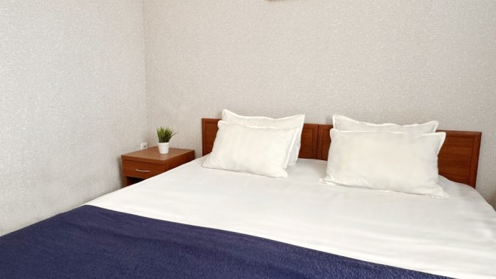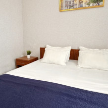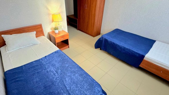 В номере 1 двуспальная и односпальная или 3 односпальные кровати, прикроватные тумбочки, шкаф, зеркало, стол и стул.