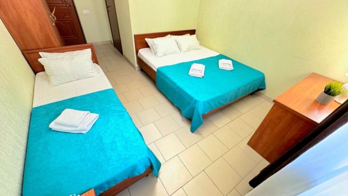 В номере предусмотрены двуспальная и односпальные или3 односпальные кровати (с возможностью соединить), прикроватные тумбочки, вместительный шкаф, стол и стул, зеркало. Номер оснащен сплит-системой, телевизором, мини-холодильником, электрическим чайником, феном, принадлежностями для душа.