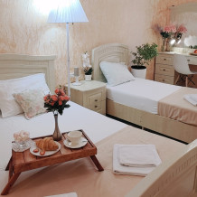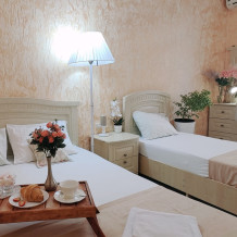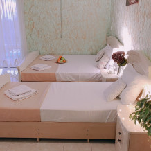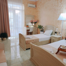 Номер оборудован: двуспальная кровать, две односпальные кровати, прикроватные тумбочки, зеркало, шкаф, туалетный столик, мини-холодильник, телевизор, кондиционер. Ванная комната: душ, зеркало, раковина и туалет. Французский балкон.