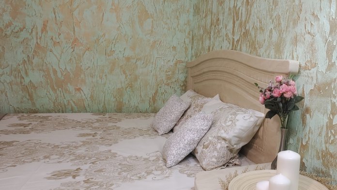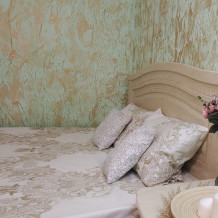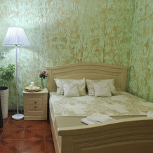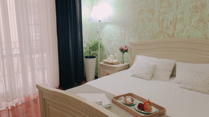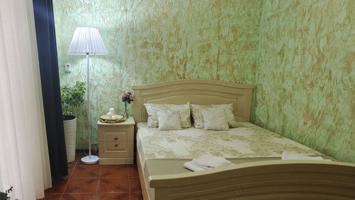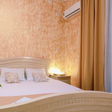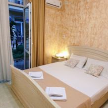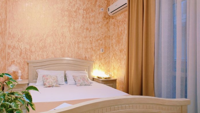 Номер оборудован: двуспальная кровать, прикроватная тумбочка, зеркало, шкаф, туалетный столик, мини-холодильник, телевизор, кондиционер