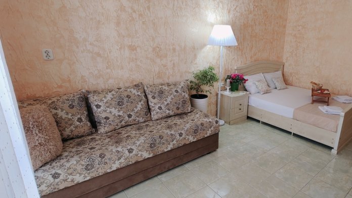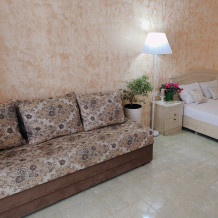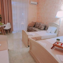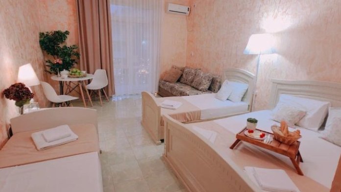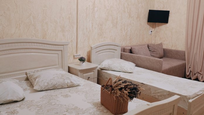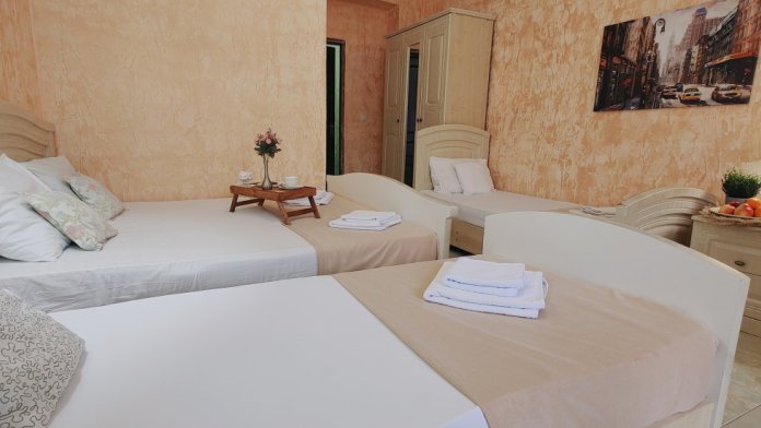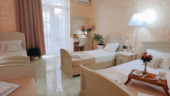 Номер оборудован: двуспальная кровать, две односпальные кровати, диван-кровать, прикроватные тумбочки, зеркало, шкаф, туалетный столик, мини-холодильник, телевизор, кондиционер