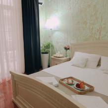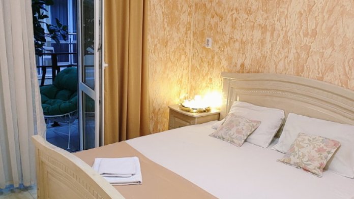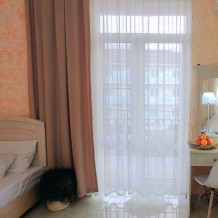 Номер оборудован: двуспальная кровать, прикроватная тумбочка, зеркало, шкаф, туалетный столик, мини-холодильник, телевизор, кондиционер. Ванная комната: душ, зеркало, раковина и туалет. Французский балкон.