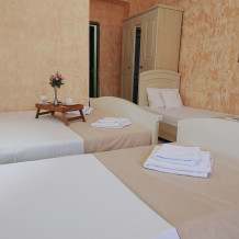 Номер оборудован: двуспальная кровать, две односпальные кровати, прикроватные тумбочки, зеркало, шкаф, туалетный столик, мини-холодильник, телевизор, кондиционер. Ванная комната: душ, зеркало, раковина и туалет. Классический балкон.