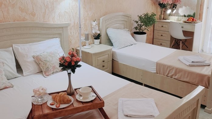 Номер оборудован: двуспальная кровать, две односпальные кровати, прикроватные тумбочки, зеркало, шкаф, туалетный столик, мини-холодильник, телевизор, кондиционер