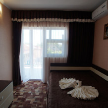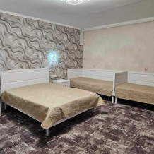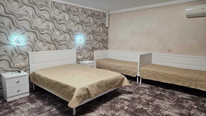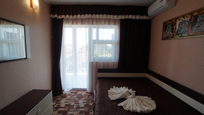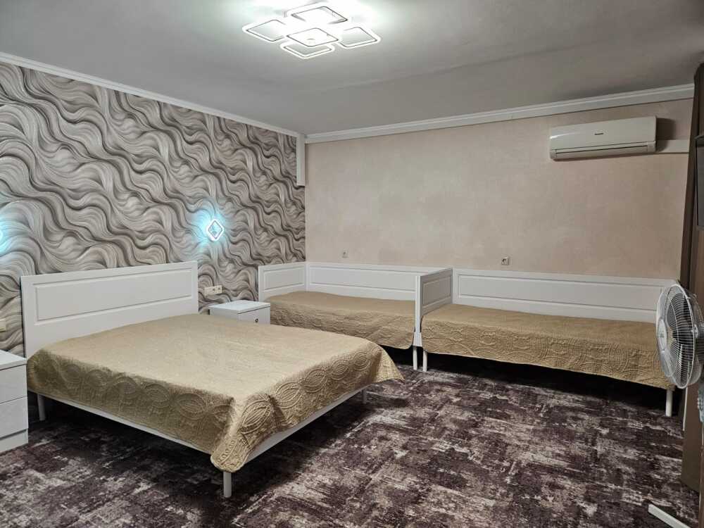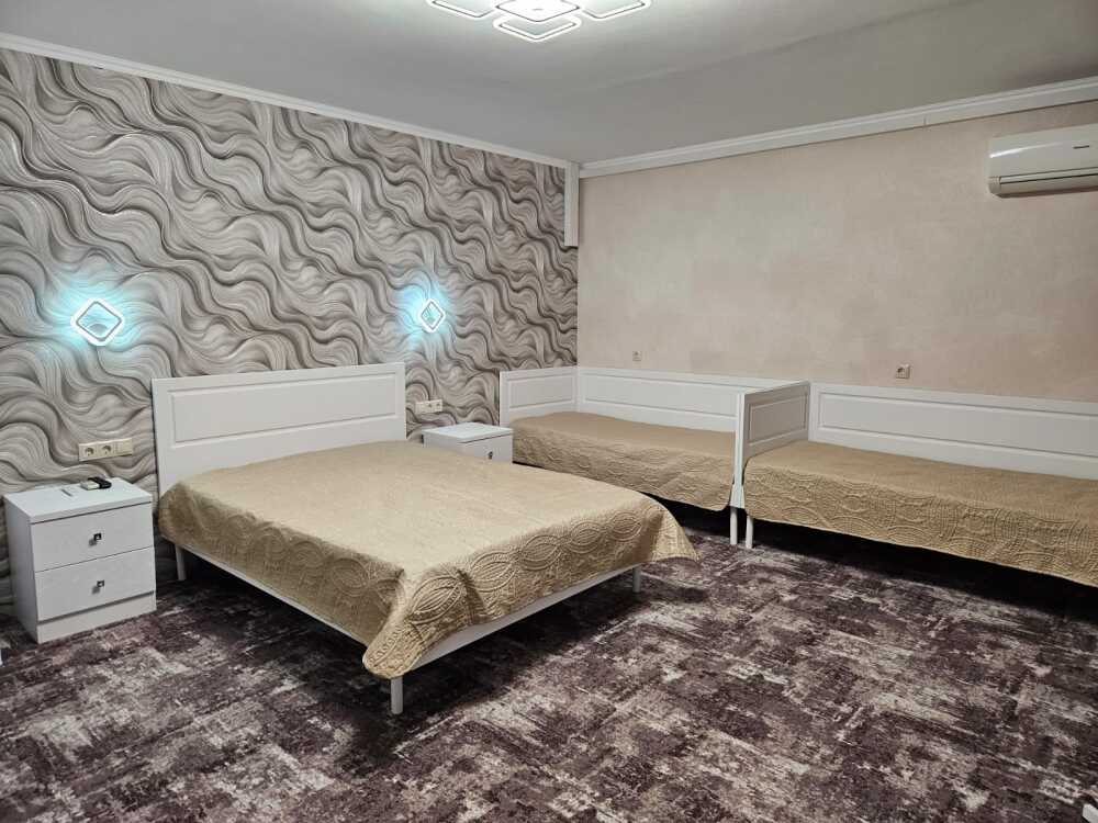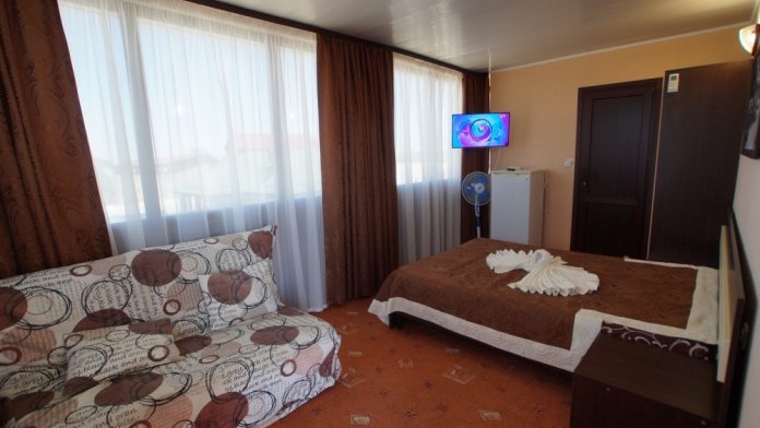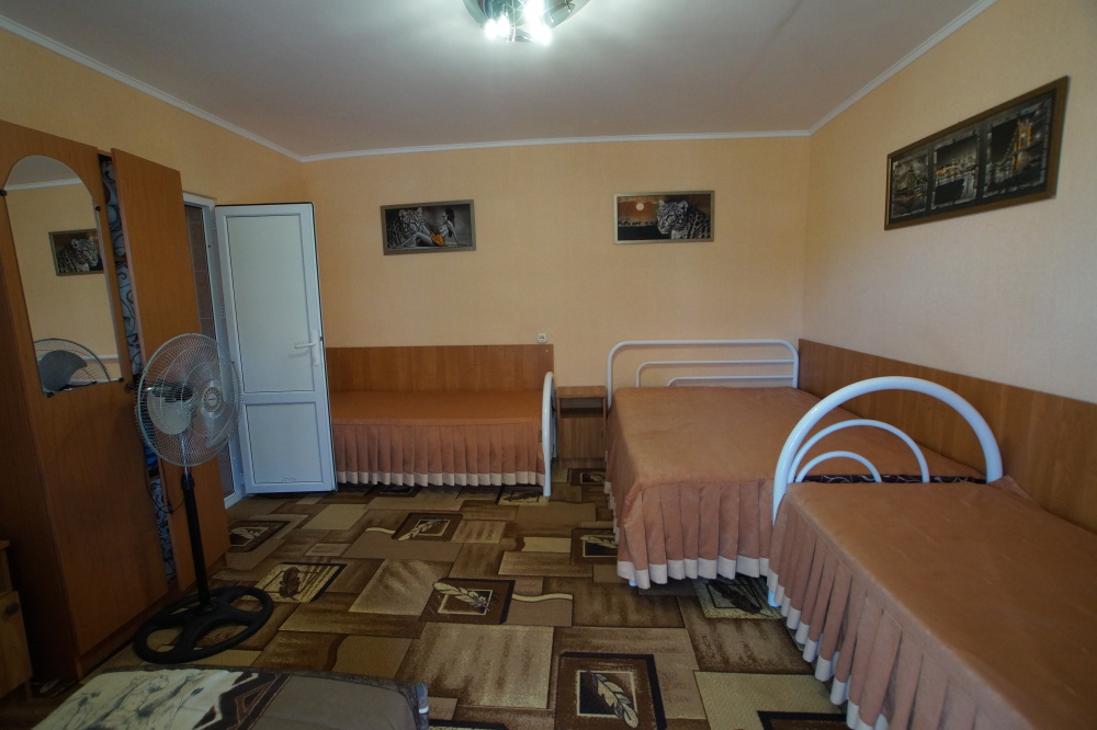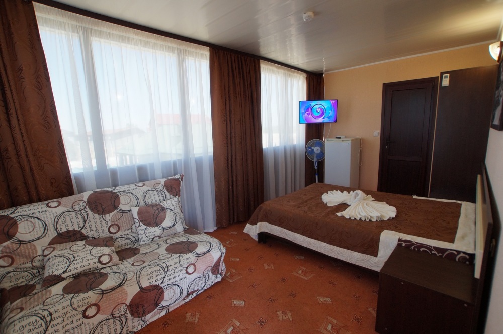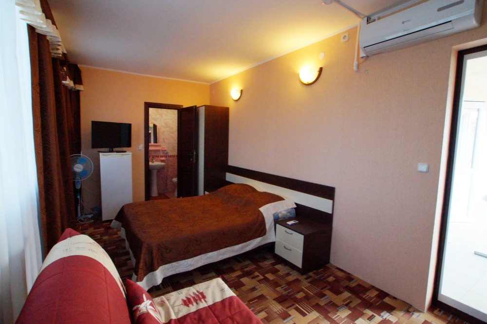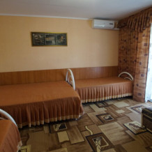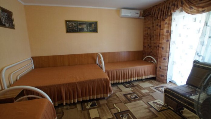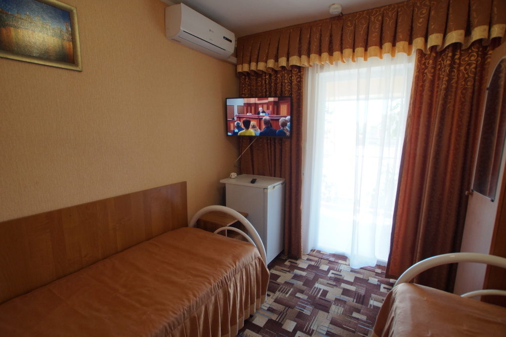 В номере: двуспальная кровать и 2 односпальные, душ с туалетом, телевизор, холодильник, сплит-система, вентилятор, постельные принадлежности, полотенца, фен.