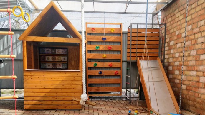 В уютном зеленом дворике имеются зоны для отдыха, качели, мангал и садовая мебель. Для детей есть детская площадка и большой деревянный домик-кафе.