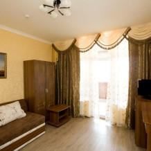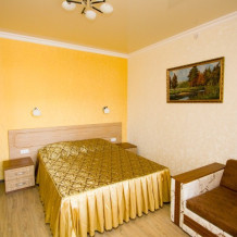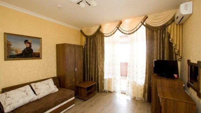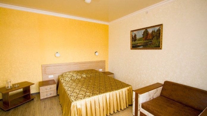 В номере две односпальные кровати или одна двуспальная кровать, диван или кресло-кровать, прикроватные тумбочки, шкаф, журнальный столик, туалетный столик, стулья, вешалка, зеркало, телевизор, сплит — система, холодильник.