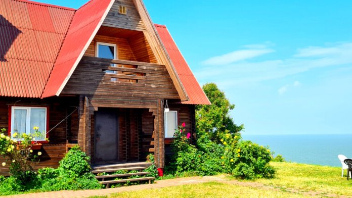 Двухэтажный дом из дерева с прекрасным видом из окон и с террасы.