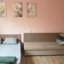В номерном фонде есть 3-местные, 4-местные, Семейные 5-местные комнаты. Семейный номер разделен на две зоны: спальная и кухонно-столовая. У каждого номера отдельный вход. 3-местные и 4-местные номера расположены на 2 этаже, лестница очень удобная и не доставляет неудобств.