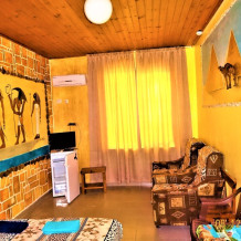 В номере 2-спальная кровать, большой диван, на террасе мини-кухня с посудой, газовой плиткой, холодильник, туалет, душ, ЖК ТВ с 20 каналами, сплит-система, шкаф 3-х створчатый для белья, стулья.