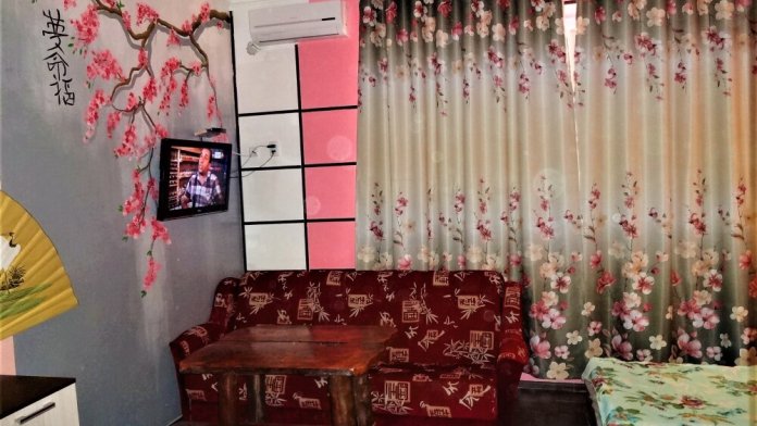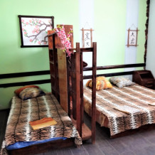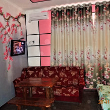 Большой номер, оформлен в китайском стиле. Есть 3 кровати с ортопедическими матрацами, раскладной диван-книжка, туалет, душ, мини-кухня с посудой, с 2-х конфорочной эл. плиткой, стулья, холодильником, сплит-система, ЖК ТВ с 20 каналами.