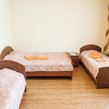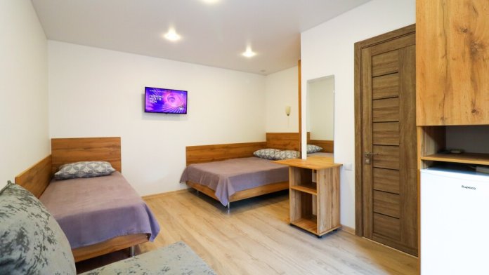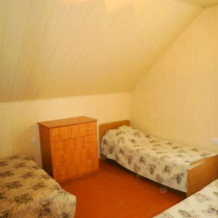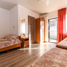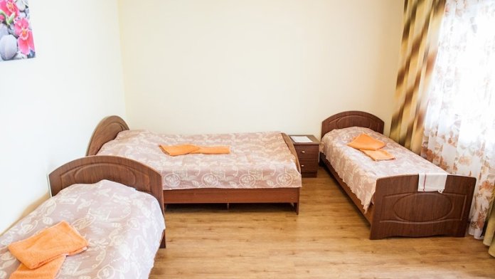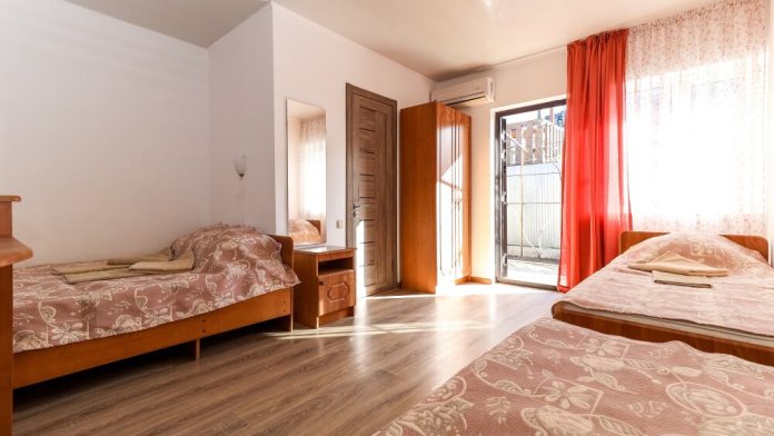 В коттедже 3 комнаты. В каждой комнате 3 кровати, прикроватные тумбочки и шкафы. Мощная сплит-система, которая находится в коридоре, она охватывает и охлаждает сразу весь домик. Тот плюс, что кондиционер находится не в каждой комнате, не даст простыть Вашим детям и не даст испортить отдых на азовском море с детьми, но сделает номера прохладными. Санузел оборудован отдельным входом в ванную и отдельным входом туалет.