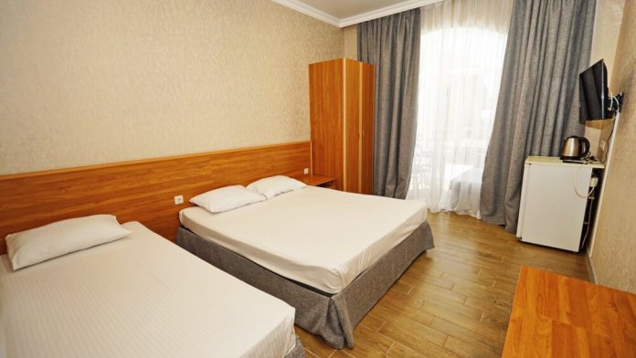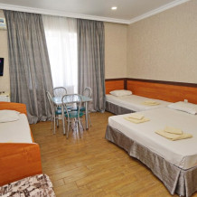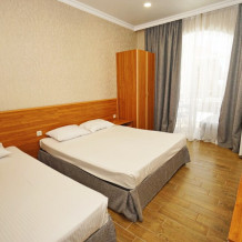В номере кровати системы трансформер (TWIN/ DBL) и две односпальные кровати, ортопедические матрасы. Стол, стулья, тумбочка, мягкая мебель, гардероб. ТВ, мини-холодильник, набор посуды, чайник. Сплит-система, Wi-Fi. Совмещенный санузел с душевой кабинкой, гигиенические средства, полотенца. Панорамный вид с балкона на живописные горы Кавказкого хребта. Большинство номеров данной категории расположены на 3,4 этаже. Доп. места предусмотрены (раскладной диван, кресло-кровать, еврораскладушка).
