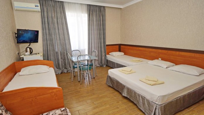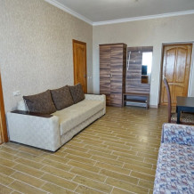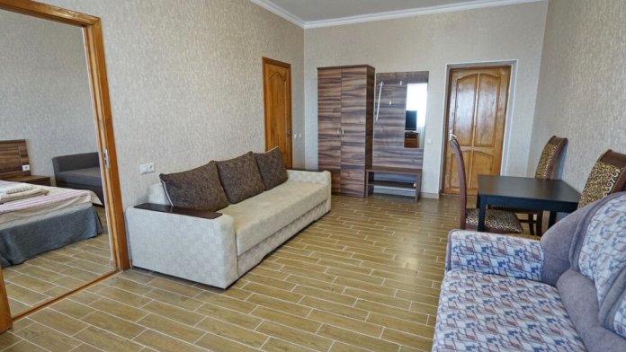 Мебель из экологического материала: стол с настольной лампой, стулья, тумбочки, комоды, гардероб, шкаф. ТВ в каждой комнате, холодильник. Сплит-система, Wi-Fi. Совмещенный санузел с ванной, гигиенические средства, фен, полотенца. Набор посуды, чайник, гладильная доска/утюг, сушилка для белья. Модульная балконная мебель. Панорамный вид с балкона на прекрасное Черное чистое море и пляж. Номера данной категории расположены на 4 этаже. Доп. места предусмотрены