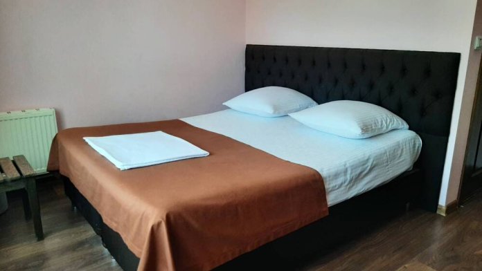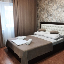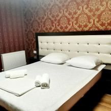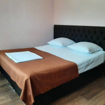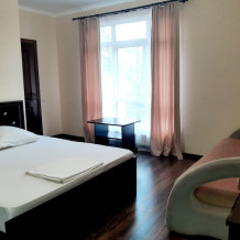 Двухместный номер площадью 18 кв. м. Подходит для размещения 2 человек. Имеет спальню с приятным интерьером. В номере: 1 двуспальная кровать. Имеется телевизор, кондиционер, шкаф, вешалка, рабочий стол, стулья, холодильник. Индивидуальная ванная комната: душ, раковина, туалет. В стоимость входит: Постельное бельё, полотенца, мыло. WI-Fi бесплатно на всей территории. Бесплатная парковка, а так же на территории имеется стационарный открытый бассейн.