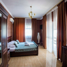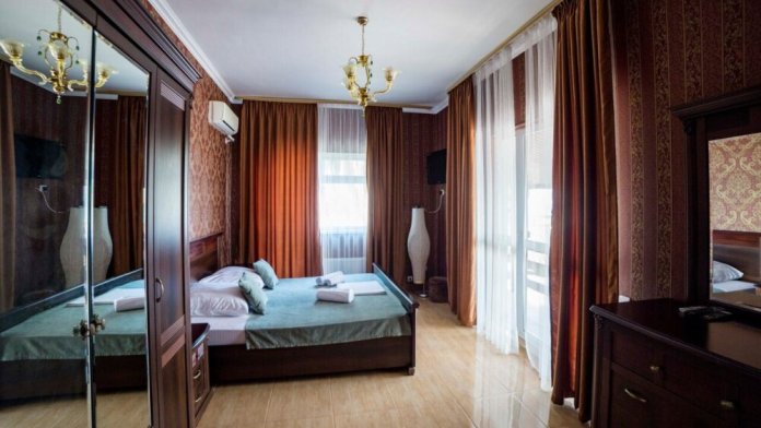 Номер площадью 40 кв. м с видом на море. Подходит для размещения 6 человек. Имеет 2 спальни с приятным интерьером. В номере: 2 двуспальные кровати, 1 двуспальный диван. Имеется телевизор, кондиционер, шкаф, вешалка, зеркало, журнальный столик, стулья, собственная кухня со всей необходимой техникой. Индивидуальная ванная комната: душ, раковина, туалет. В стоимость входит: Постельное бельё, полотенца, мыло. WI-Fi бесплатно на всей территории. Бесплатная общественная парковка за территорией.
