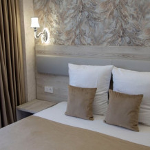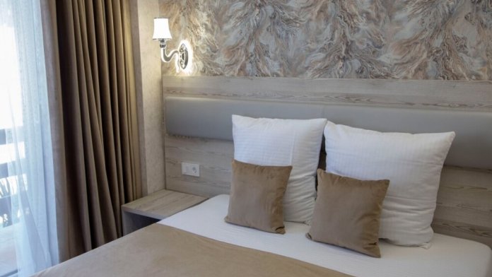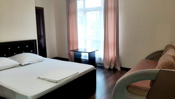 Номер площадью 27 кв. м с видом на море. Подходит для размещения 4 человек. Имеет спальню и гостиную с приятным интерьером. В номере: 1 двуспальная кровать, 1 двуспальный диван. Имеется телевизор, кондиционер, шкаф, вешалка, рабочий стол, стулья, холодильник. Индивидуальная ванная комната: душ, раковина, туалет. В стоимость входит: Постельное бельё, полотенца, мыло. WI-Fi бесплатно на всей территории. Бесплатная общественная парковка на территорией. На территории имеется стационарный открытый бассейн.
