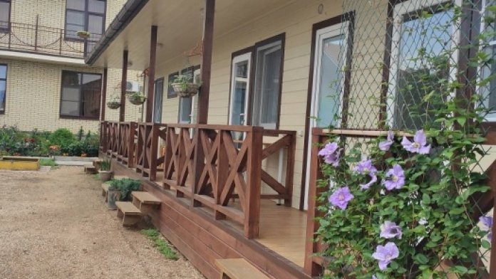 Отдельно стоящий 2-комнатный домик с верандой и душевой, в домике двуспальная кровать, две односпальные кровати. Доп. место — 1. На веранде кухонная мебель, посуда для самостоятельного приготовления пищи. Туалет рядом с домиком.