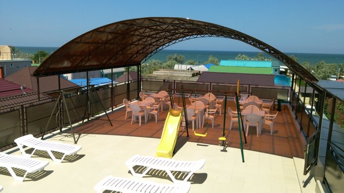 На крыше здания есть терраса для отдыха, откуда открывается великолепный вид на море. Здесь можно позагорать на шезлонгах, покачаться на качелях, отдохнуть за столиком после дневной жары. Вечером здесь более прохладно и комфортно из-за свежего ветра с моря. Для гостей проводятся вечера Караоке. Для детей имеется спортивная площадка, включающая горку, 2 качели.