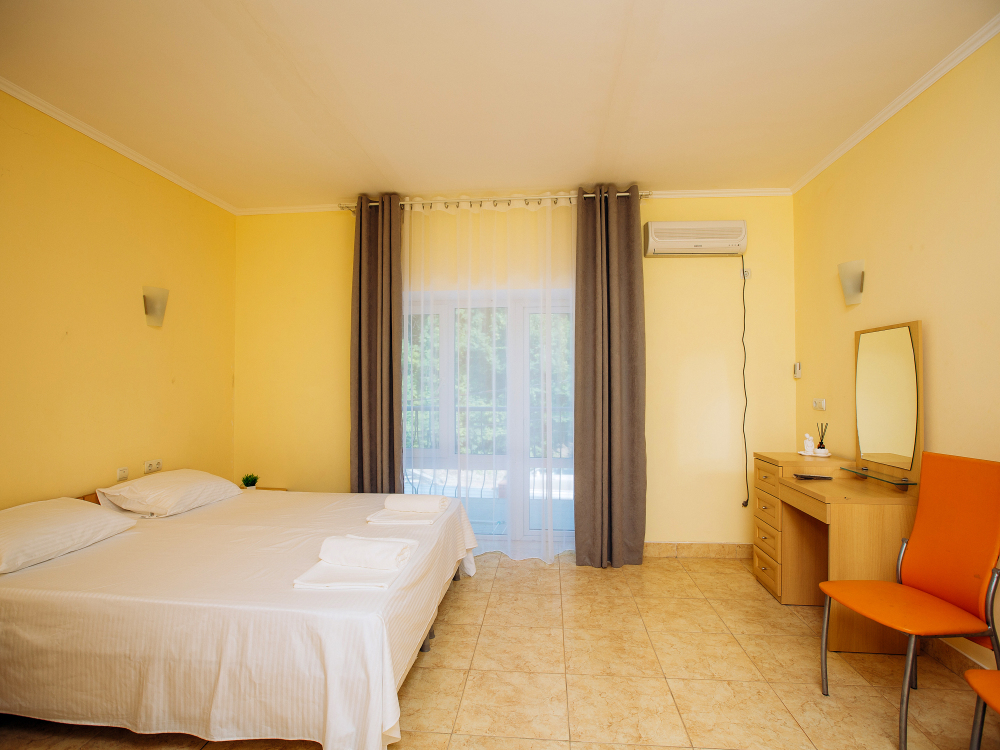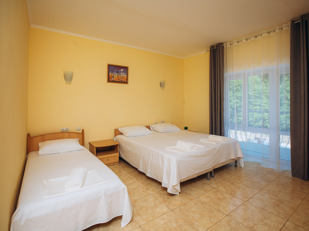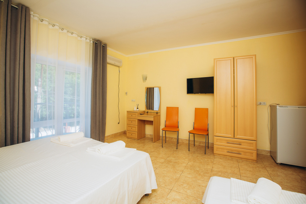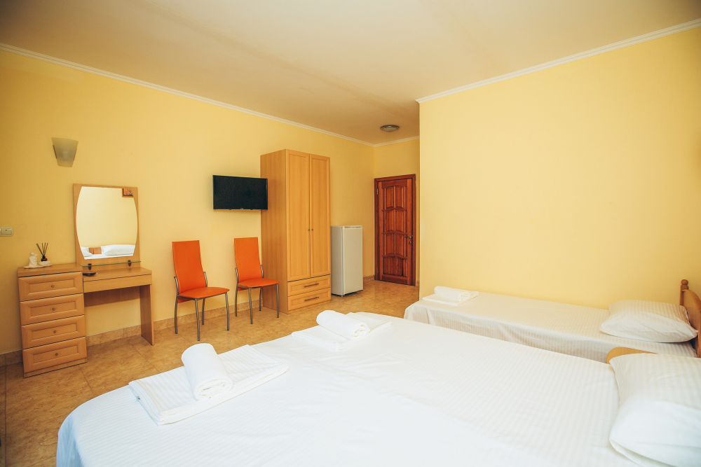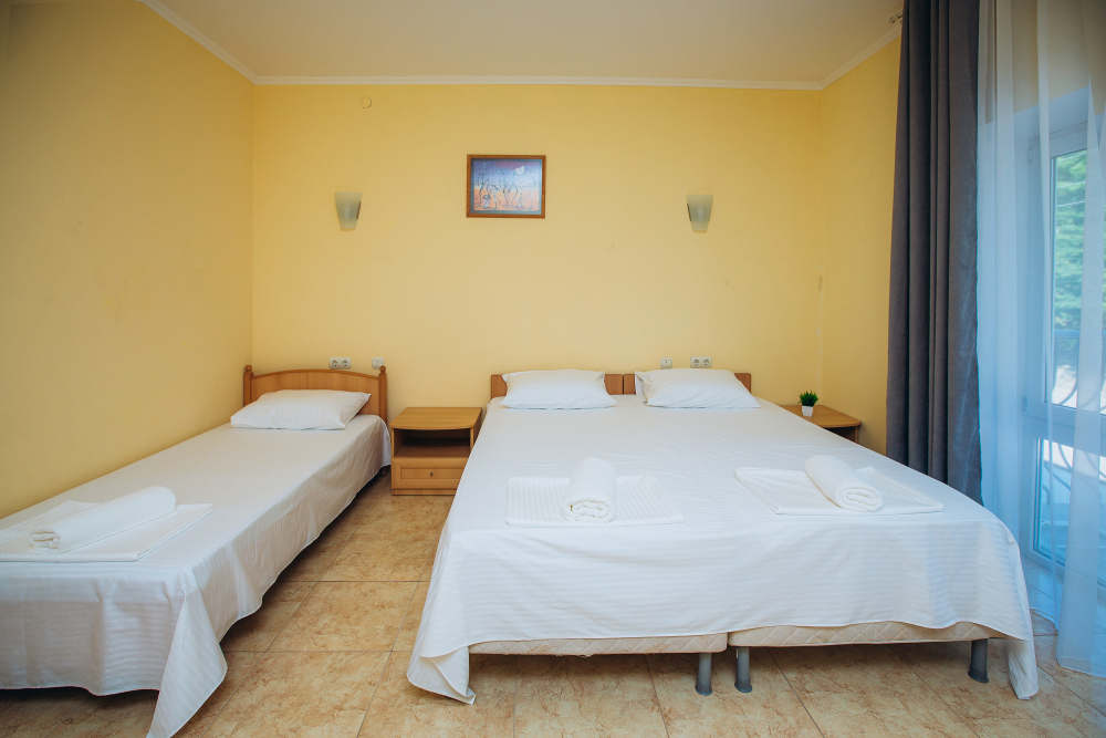 Предлагаем к бронированию современный, просторный и уютный 3-местный номер комфорт. Номер оборудован всем необходимым: ТВ, холодильник, кондиционер, удобства в номере.