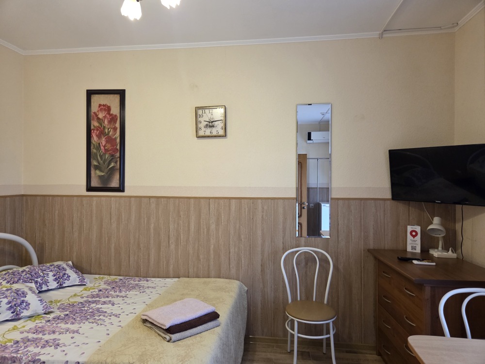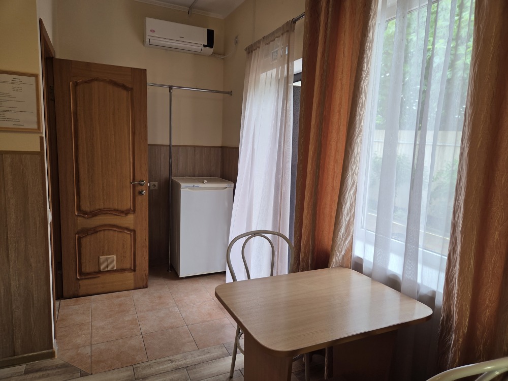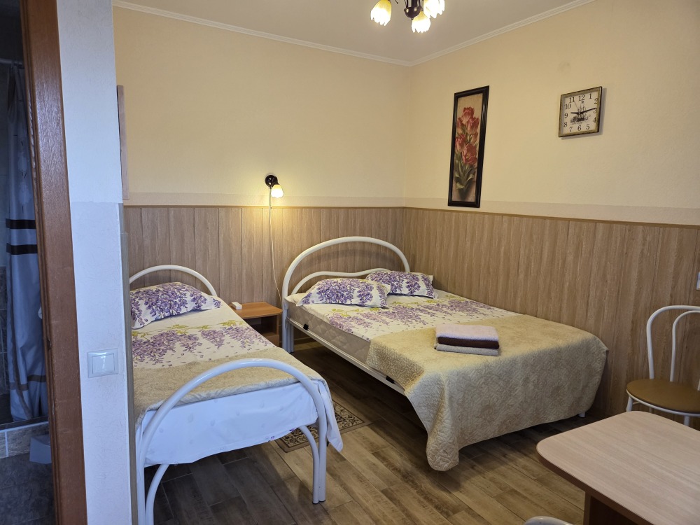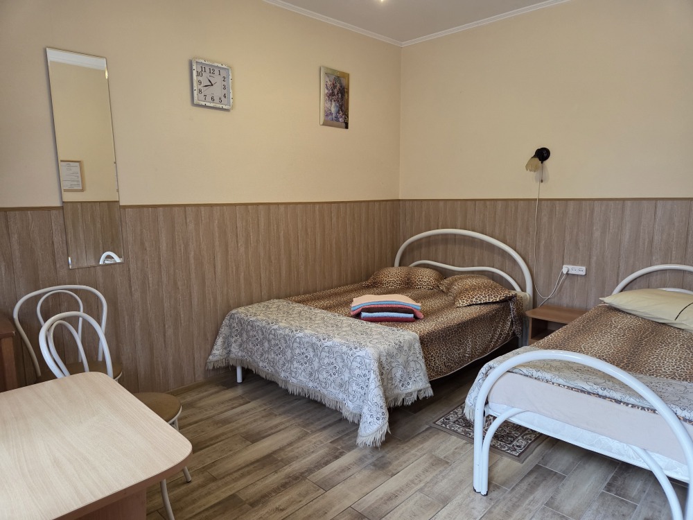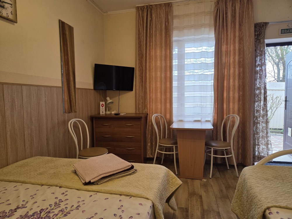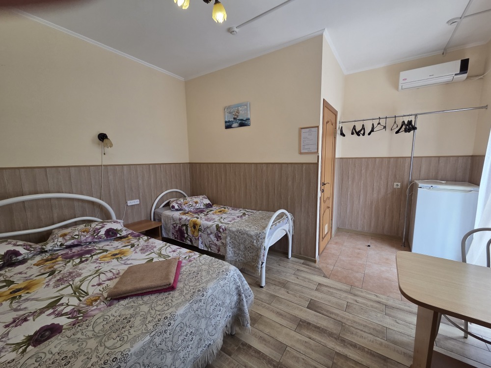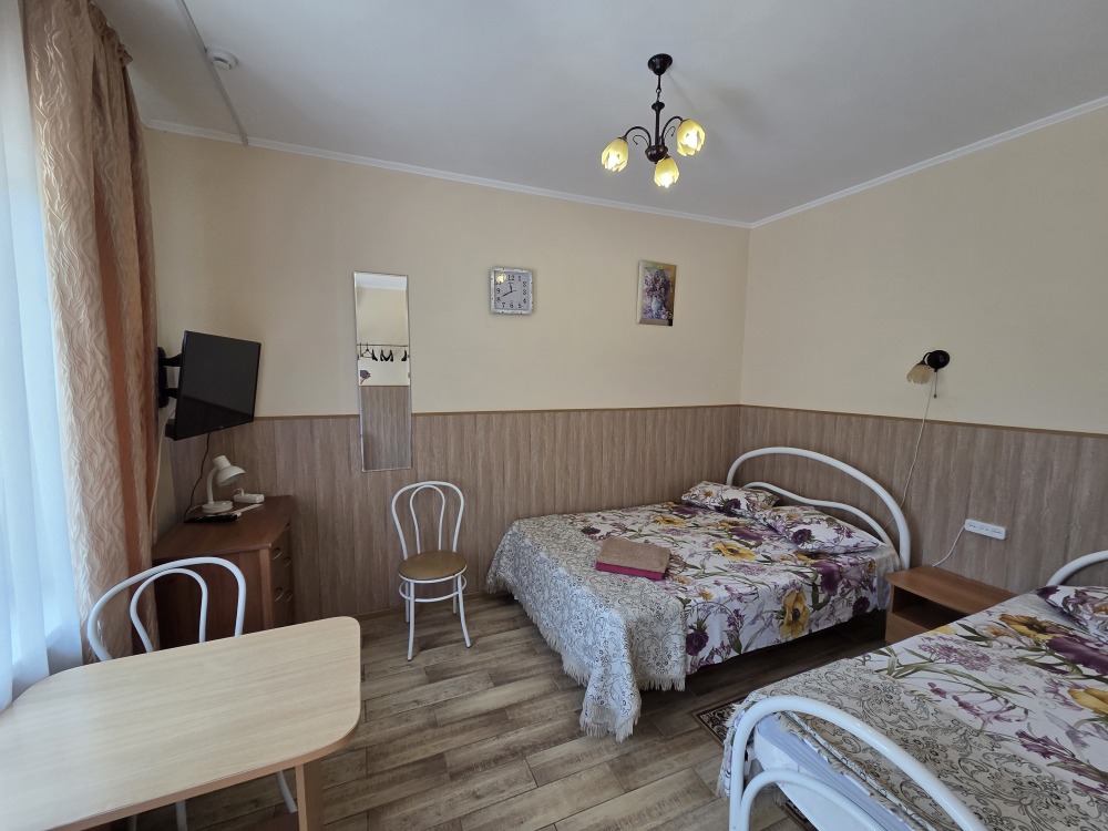 В номере холодильник,телевизор,кондиционер, душ,туалет. Одна 2хспальная кровать и одна односпальная,комод,тумбочка прикроватная,стол и стулья.
