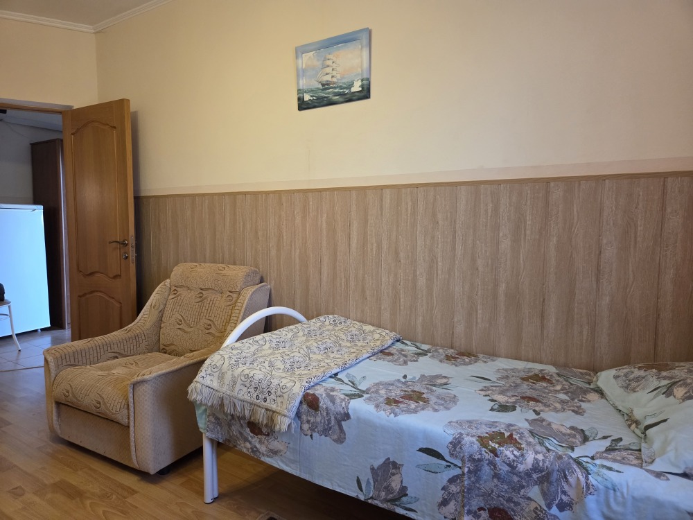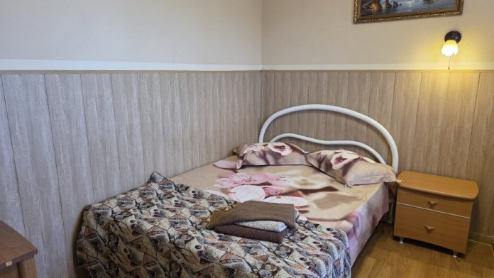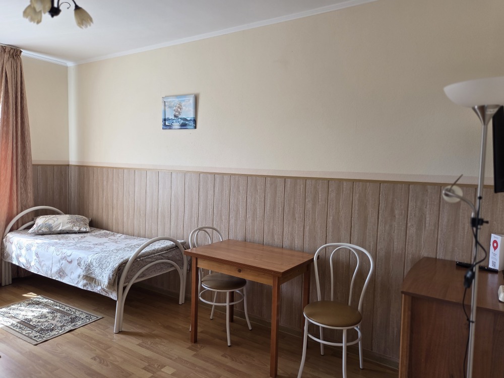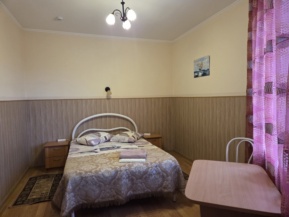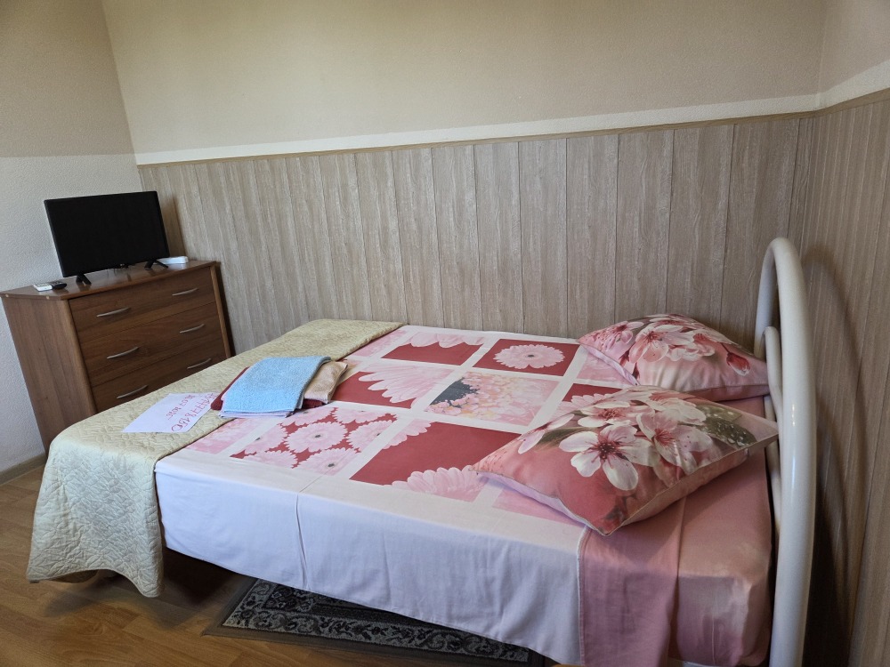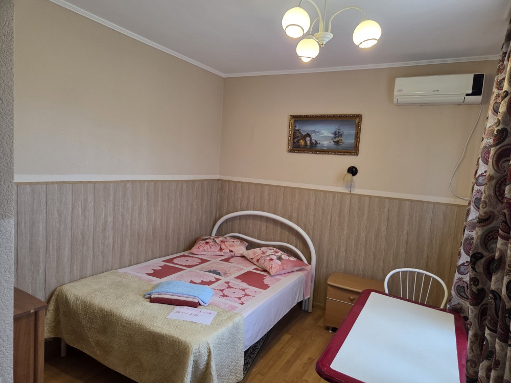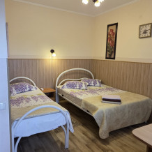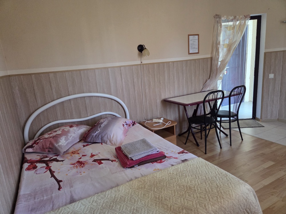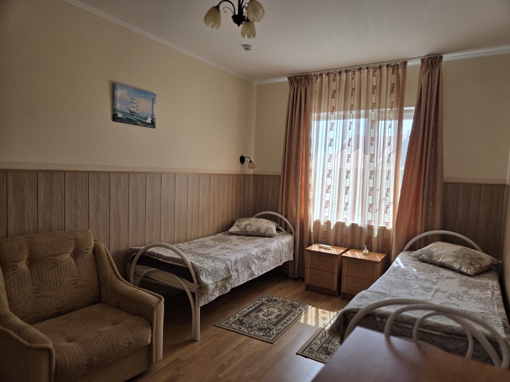 В номере холодильник,телевизор,кондиционер, душ,туалет. Одна 2хспальная кровать и одна односпальная,комод,тумбочка прикроватная,стол и стулья.