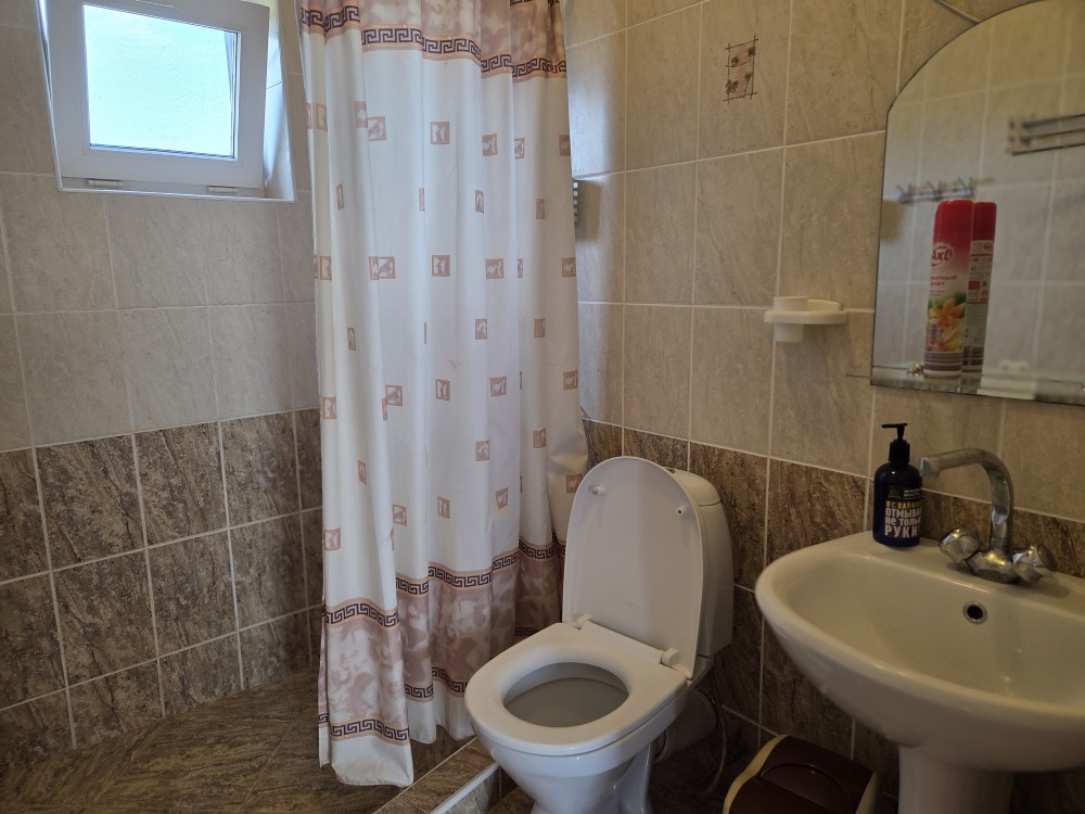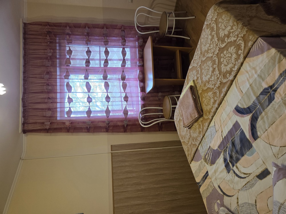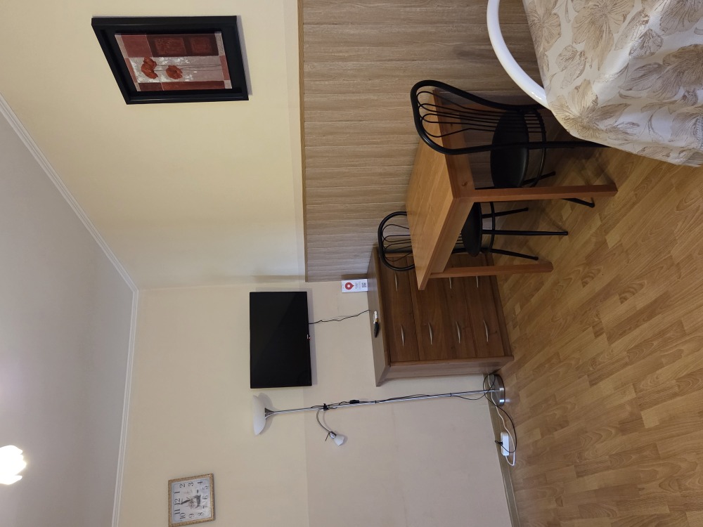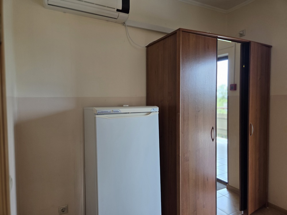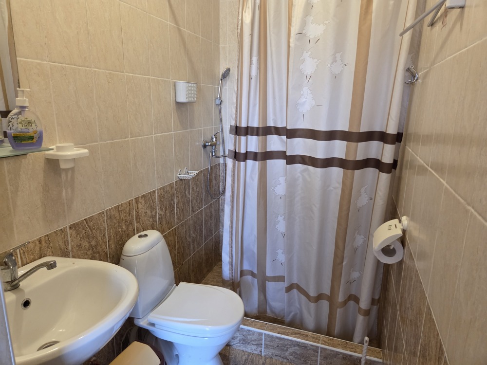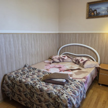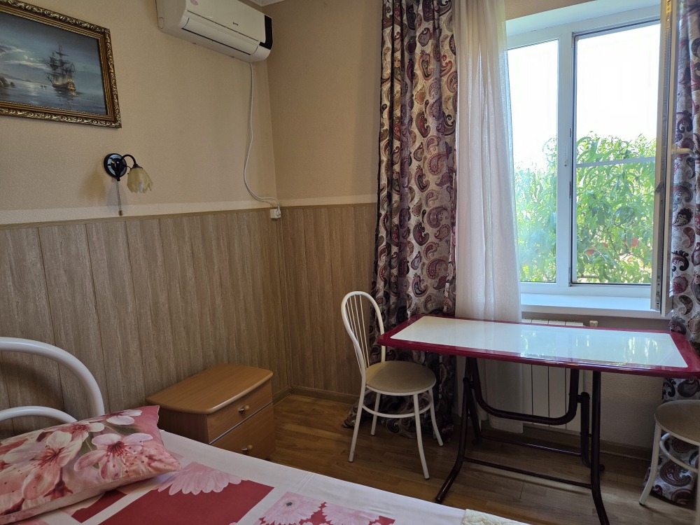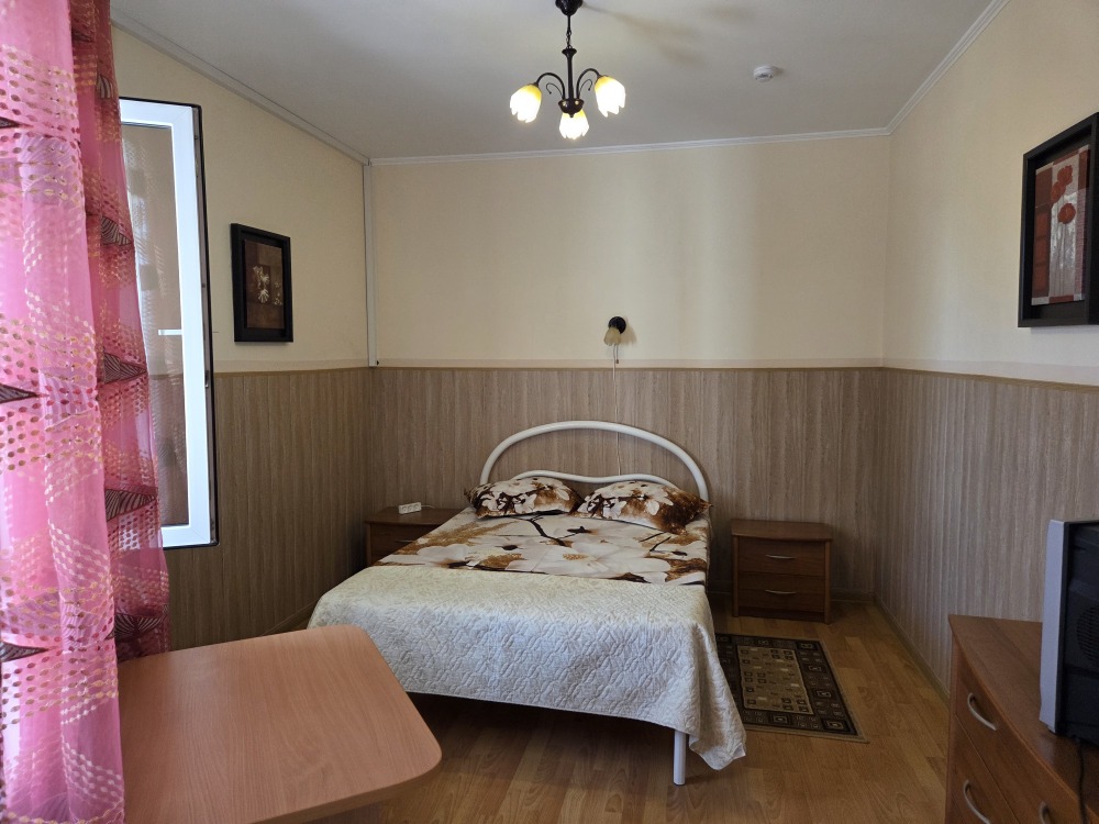 В номере холодильник,телевизор,кондиционер, душ,туалет. Одна 2хспальная кровать и одна односпальная,комод,тумбочка прикроватная,стол и стулья.