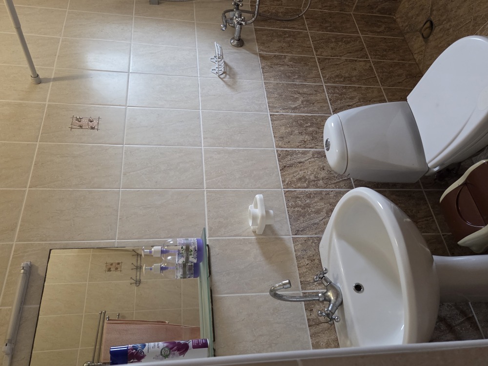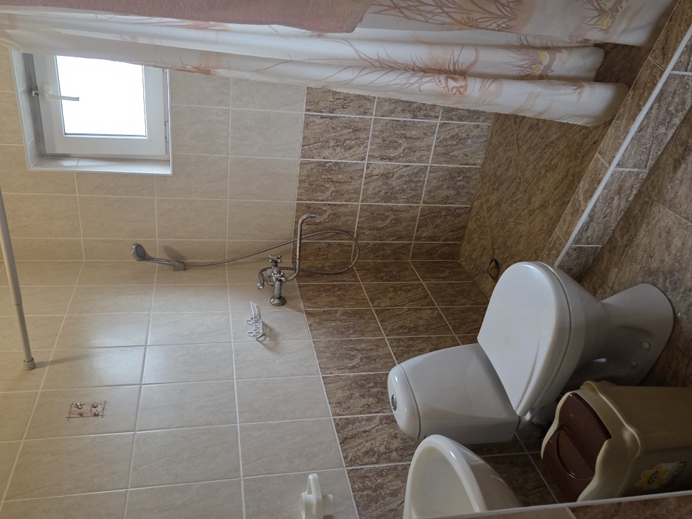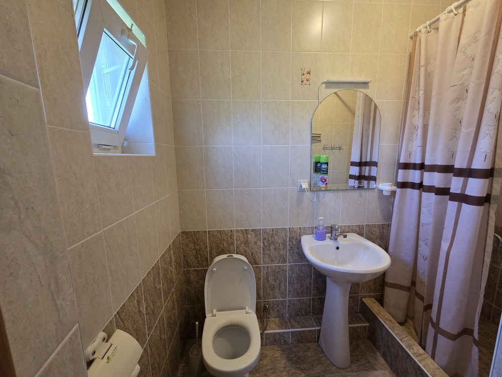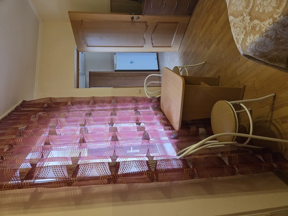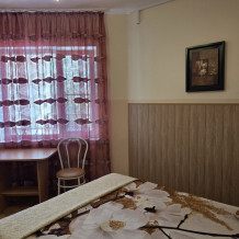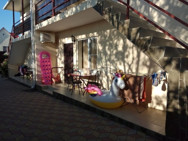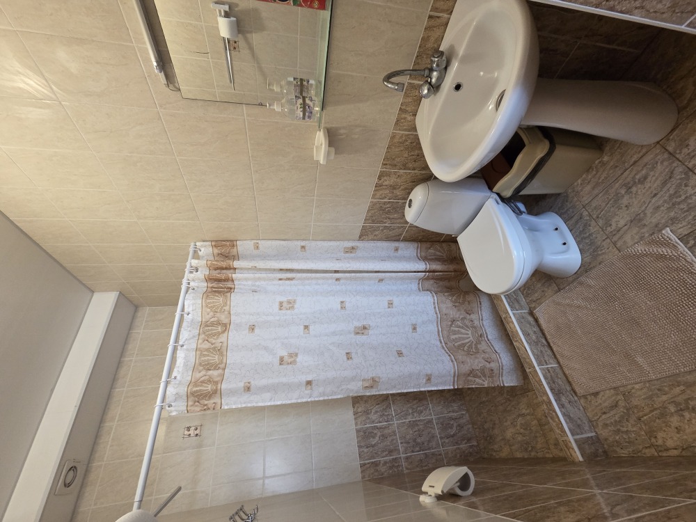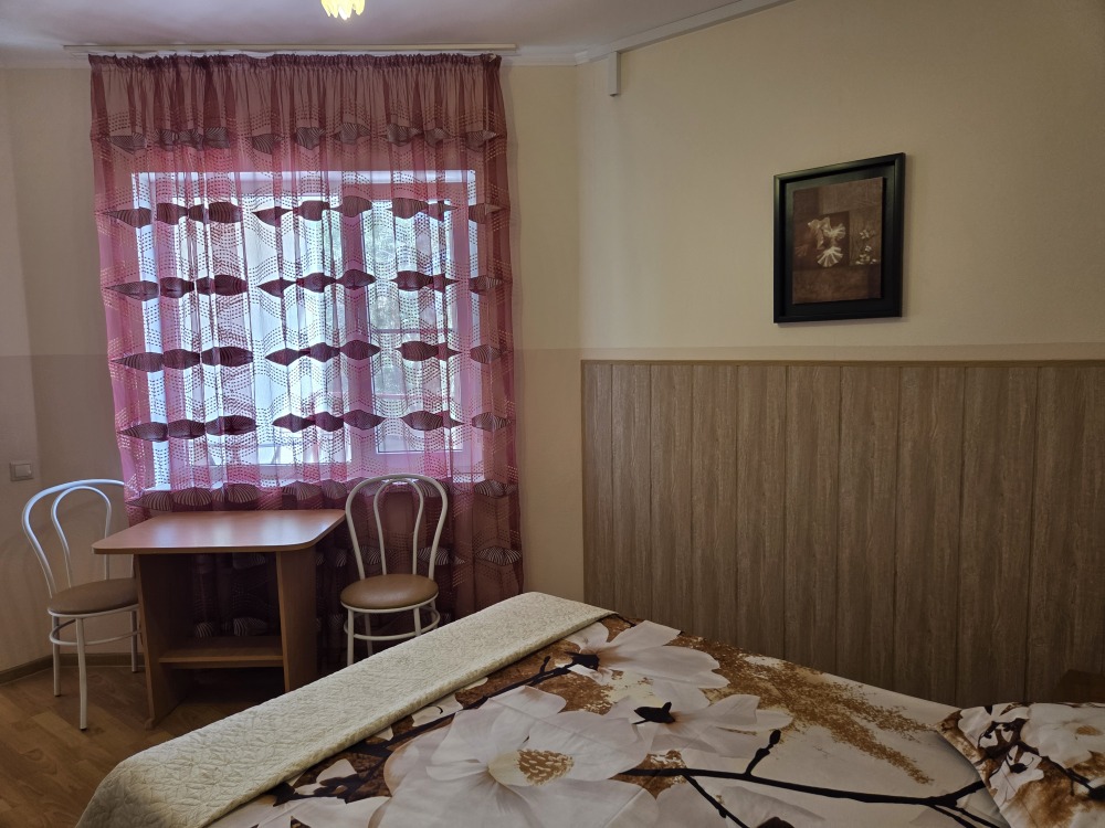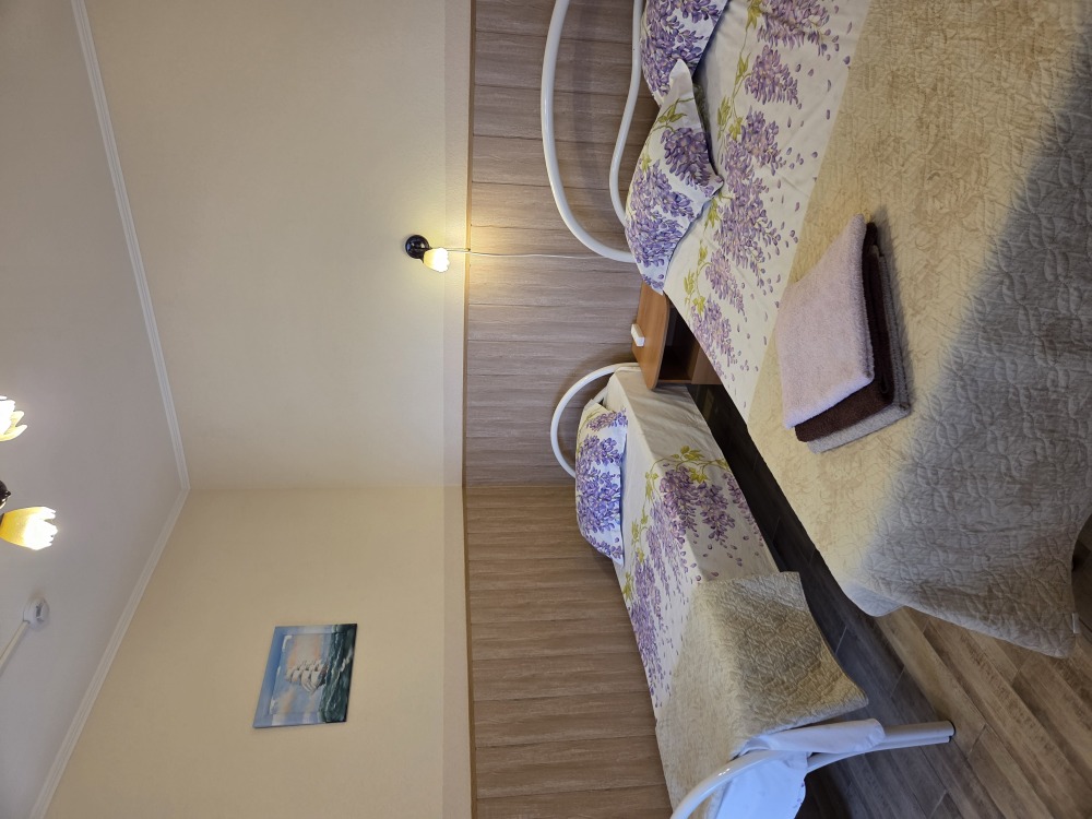 В номере холодильник,телевизор,кондиционер, душ,туалет. Одна 2хспальная кровать и одна односпальная,комод,тумбочка прикроватная,стол и стулья.