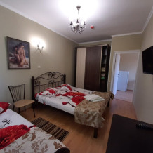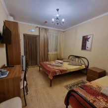 Номер с двумя раздельными комнатами, две двуспальные и односпальная кровати или одна двуспальная и 3 односпальные кровати, хол., TV, с/у с душем, шкаф-купе, мебель, большой балкон с мебелью, сушилка для белья, слит система.