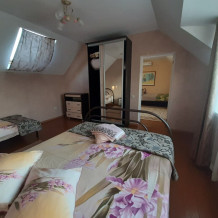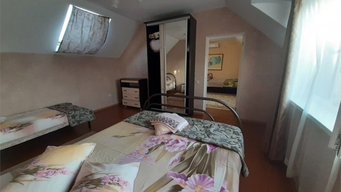 Большой двухкомнатный двухэтажный номер, балкон, сушилка, хол., TV, сплит система, с/у с душем, две двуспальные кровати, одна односпальная кровать, мебель, обеденный стол. Вид на море.