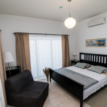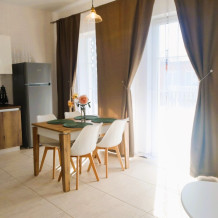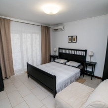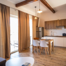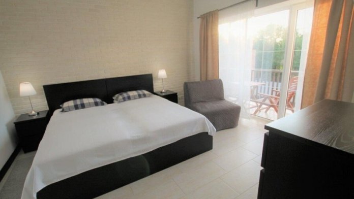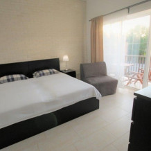Комфортные четырехместные двухкомнатные апартаменты с балконом-террасой и боковым видом в сад, общей площадью 35 кв.м., c полноразмерной кухней и небольшой обеденной зоной, расположены на 1 этаже. Спальных мест 4: двуспальная кровать king-size и 2 кресла-кровати. Апартаменты оборудованы кондиционером (сплит-система), спутниковым телевидением в спальне и гостиной, сейфом и мини-холодильником, имеют отдельный туалет и душ.