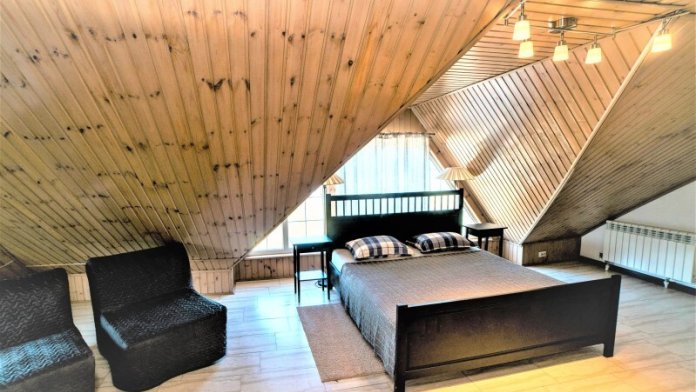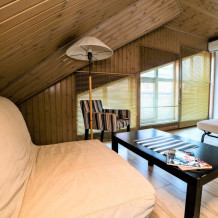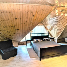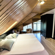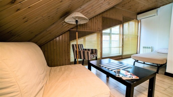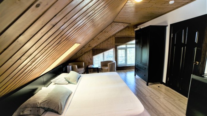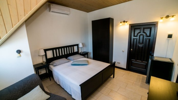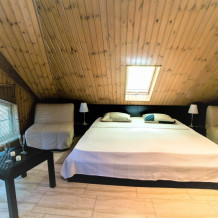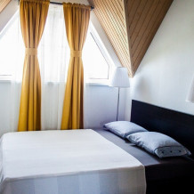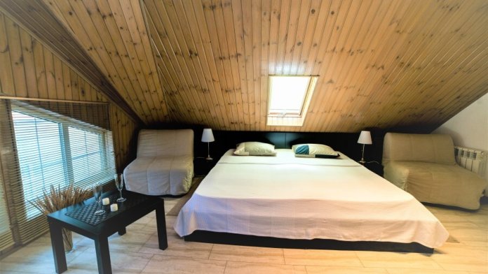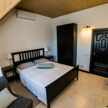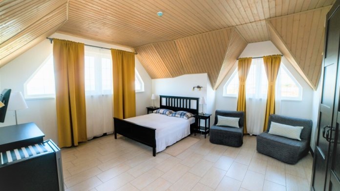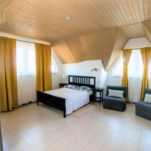 Просторный 4-местный мансардный номер с прямым видом на море, площадью 32м², с двуспальной кроватью king-size и двумя креслами-кроватями. Номер оборудован кондиционером (сплит-система), спутниковым телевидением, сейфом и мини-холодильником, имеет отдельный туалет с ванной.