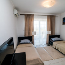 Комфортный трехместный семейный номер с боковым видом на море, площадью 18 кв. м., расположен на 3 этаже (мансарда). Спальных мест 3: двуспальная кровать и кресло-кровать. Номер оборудован кондиционером (сплит-система), спутниковым телевидением, сейфом и мини-холодильником, имеет отдельный туалет и душ.