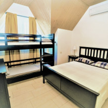 Уютный четырехместный семейный номер с боковым видом на море, площадью 19 кв. м., расположен на 3 этаже (мансарда). Спальных мест 4: двуспальная кровать и двухъярусная кровать. Номер оборудован кондиционером (сплит-система), спутниковым телевидением, сейфом и мини-холодильником, имеет отдельный туалет и душ.