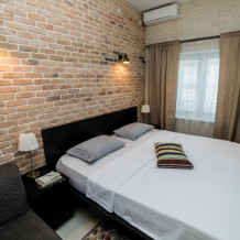 Компактный двухместный номер с боковым видом на море, площадью 14 кв. м., расположен на 3 этаже (мансарда), с двуспальной кроватью king-size. Номер оборудован кондиционером (сплит-система), спутниковым телевидением, сейфом и мини-холодильником, имеет отдельный туалет и душ.