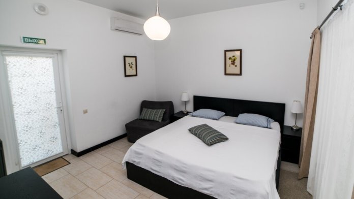 Просторный 4-местный двухкомнатный номер с кухней и собственным внутренним двориком-патио с мангальной зоной; расположен на 1-м этаже.