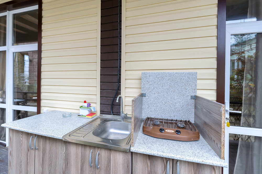 На территории расположена парковка, а также зона барбекю. Большая часть территории находится в тени виноградной лозы.